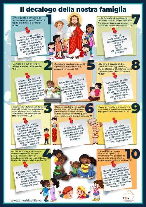 Dopo il Rosario per i Fidanzati, il Rosario per le Famiglie, la campagna social #WalkingwithFamilies, i 10 Video Amoris Laetitia con il Santo Padre in dialogo con famiglie di tutto il mondo, eventi accademici e pubblicazioni, esce un Decalogo per bambini con 10 consigli per crescere insieme – genitori e figli – nell’ambiente familiare, mettendo in pratica ciò che papa Francesco dice nell’ esortazione apostolica Amoris Laetitia. 10 tips che i genitori e gli educatori possono donare ai più piccoli per scoprire l’importanza del dialogo in famiglia, della fratellanza, del valore di sé e degli altri, dello spirito di servizio.