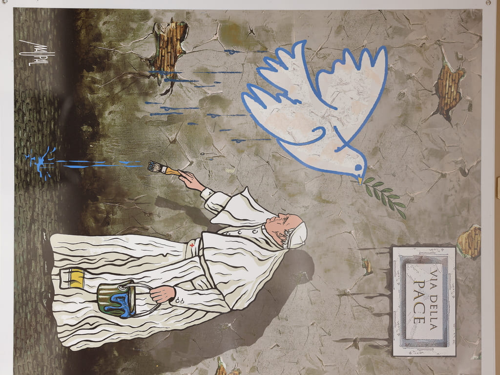 Nelle vesti di uno street artist papa Francesco viene sorpreso mentre ultima il disegno di una colomba, la cui sagoma cita quella concepita da Pablo Picasso per il primo Congresso mondiale per la pace. La colomba puรฒ sempre volare e, trattenendo nel becco il ramoscello d’ulivo, testimonia la riconciliazione tra Dio e l’uomo. La preghiera di oggi รจ che il mondo possa far germogliare il frutto piรน prezioso: la pace per tutti.
