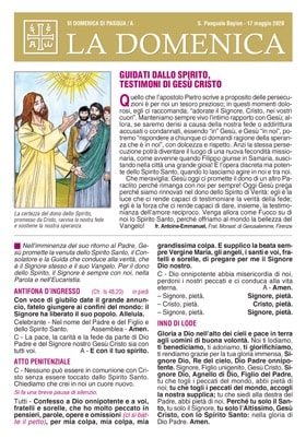 Nell’imminenza del suo ritorno al Padre, Gesรน promette la venuta dello Spirito Santo, il Consolatore e la Guida che conduce alla veritร , che รจ il Signore stesso e i/ suo Vangelo. Per il dono dello Spirito, il Signore รจ sempre con noi, nella Parola e nell’Eucaristia.