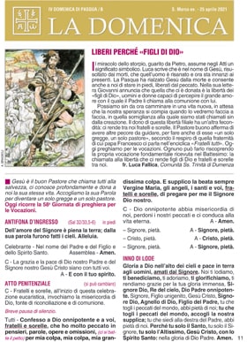 La Pasqua ha rialzato Gesรน dalla morte e consente anche a noi di stare in piedi, liberati dal peccato. Nella sua lettera Giovanni annuncia che quella che ci รจ donata รจ la libertร deiยซfigli di Dioยป, uomini e donne capaci di percepire il grande amore con il quale il Padre li chiama alla comunione con lui.