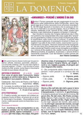 San Giovanni ricorda che lโorigine dellโamore sta in Dio:non potremo mai comprendere che cosa voglia dire โamareโse non guardiamo a Gesรน e al suo modo di amare per poterlo trasfondere nella nostra vita (II Lettura).