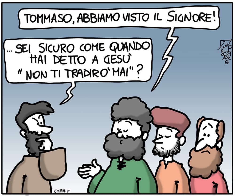 A otto giorni dalla celebrazione della Pasqua, la liturgia ci fa ascoltare e meditare un brano di Vangelo che nella collocazione temporale degli eventi รจ sincronizzato con noi. Lโ€™evangelista Giovanni ci racconta di due episodi simili che accadono lo stesso giorno della settimana. Il primo episodio si colloca proprio nel giorno della resurrezione di Gesรน e lโ€™altro otto giorni dopo. Gesรน risorto si mostra presente e vivo in mezzo alla sua comunitร  di primissimi amici. Giร  in questo cโ€™รจ lโ€™insegnamento che fin da subito i discepoli di Gesรน hanno scelto come loro giorno la domenica, e ogni otto giorni si ritrovano in quel giorno in cui tutto รจ nato. Anche noi oggi, di otto giorni in otto giorni, ci raduniamo e nella preghiera sperimentiamo la presenza di Gesรน vivente.