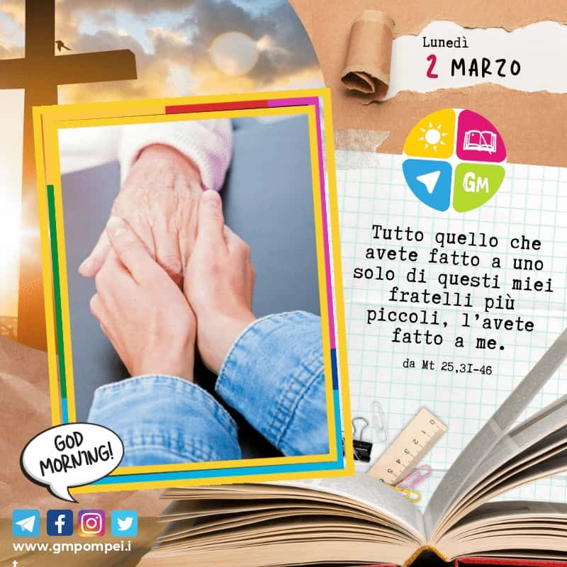 Allora i giusti gli risponderanno: “Signore, quando ti abbiamo visto affamato e ti abbiamo dato da mangiare, o assetato e ti abbiamo dato da bere? Quando mai ti abbiamo visto straniero e ti abbiamo accolto, o nudo e ti abbiamo vestito?ย Quando mai ti abbiamo visto malato o in carcere e siamo venuti a visitarti?”.ย E il re risponderร loro: “In veritร io vi dico: tutto quello che avete fatto a uno solo di questi miei fratelli piรน piccoli, l’avete fatto a me”.