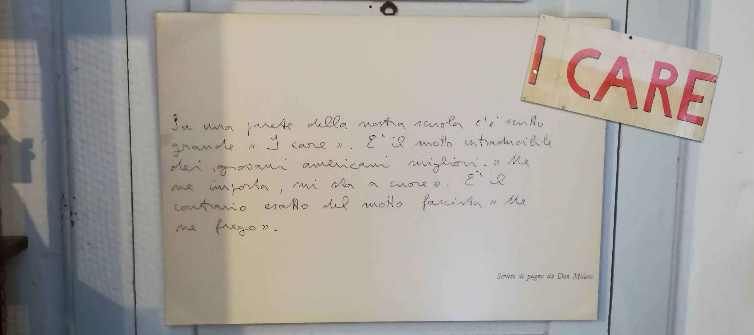 โ€œSu una parete della nostra scuola cโ€™รจ scritto grande โ€œI careโ€. Eโ€™ il motto intraducibile dei giovani americani migliori. โ€œMe ne importa, mi sta a cuoreโ€. Eโ€™ il contrario del motto fascista โ€œMe ne fregoโ€โ€ฆโ€