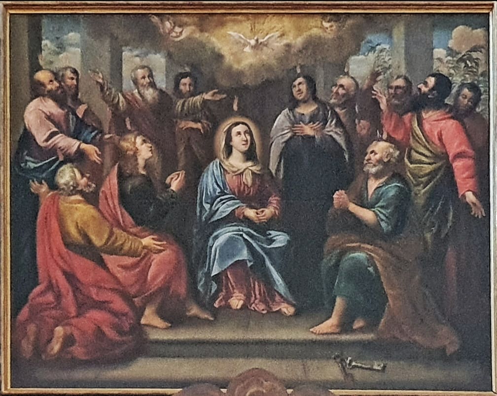 Il dipinto sopra alla porta della chiesa non puรฒ rimanere solamente una decorazione o il racconto di una storia passata che non ci riguarda. In quei personaggi sui quali scende la forza dello Spirito di Dio ci possiamo mettere noi stessi, per diventare ogni giorno e ovunque, fuori dalle porte della chiesa, un quadro vivente della Pentecoste.