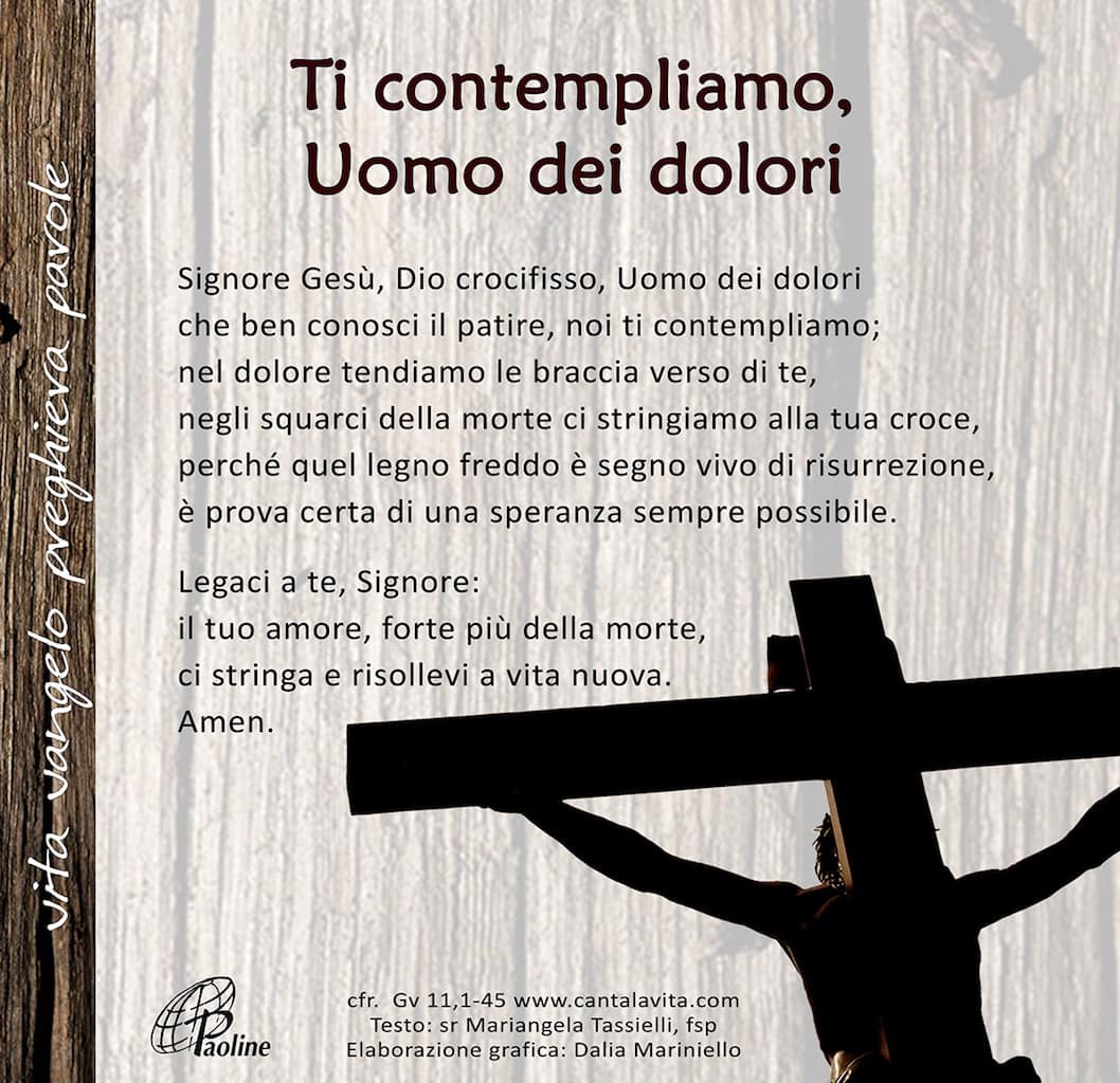 «Uomo dei dolori, che ben conosci il patire…»: non c’è altra invocazione che in questo giorno mi ritorni in mente. Non c’è invocazione che meglio mi sveli la prossimità straordinaria di Dio alla nostra fragilità, al nostro dolore, alla nostra umanità ferita.