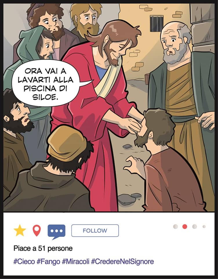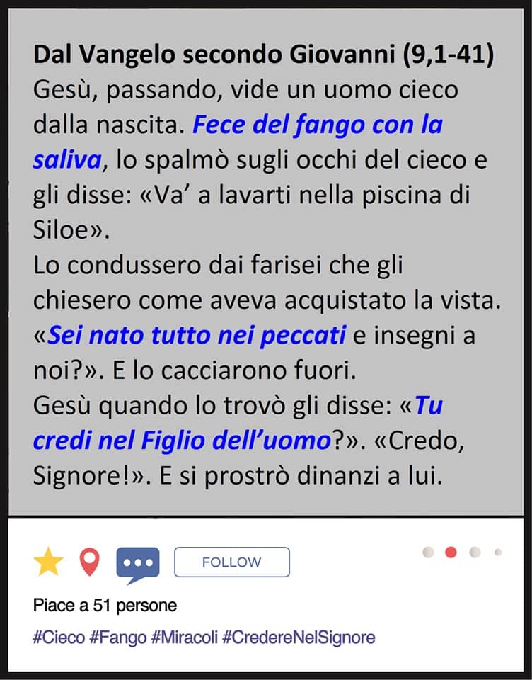 Fece del fango con la saliva. Sono due elementi che richiamano i racconti biblici della Genesi. ร