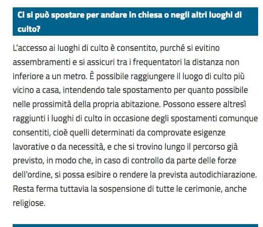 Lโ€™accesso ai luoghi di culto รจ consentito, purchรฉ si evitino assembramenti e si assicuri tra i frequentatori la distanza non inferiore a un metro. รˆ possibile raggiungere il luogo di culto piรน vicino a casa, intendendo tale spostamento per quanto possibile nelle prossimitร  della propria abitazione. Possono essere altresรฌ raggiunti i luoghi di culto in occasione degli spostamenti comunque consentiti, cioรจ quelli determinati da comprovate esigenze lavorative o da necessitร , e che si trovino lungo il percorso giร  previsto, in modo che, in caso di controllo da parte delle forze dell’ordine, si possa esibire o rendere la prevista autodichiarazione. Resta ferma tuttavia la sospensione di tutte le cerimonie, anche religiose.