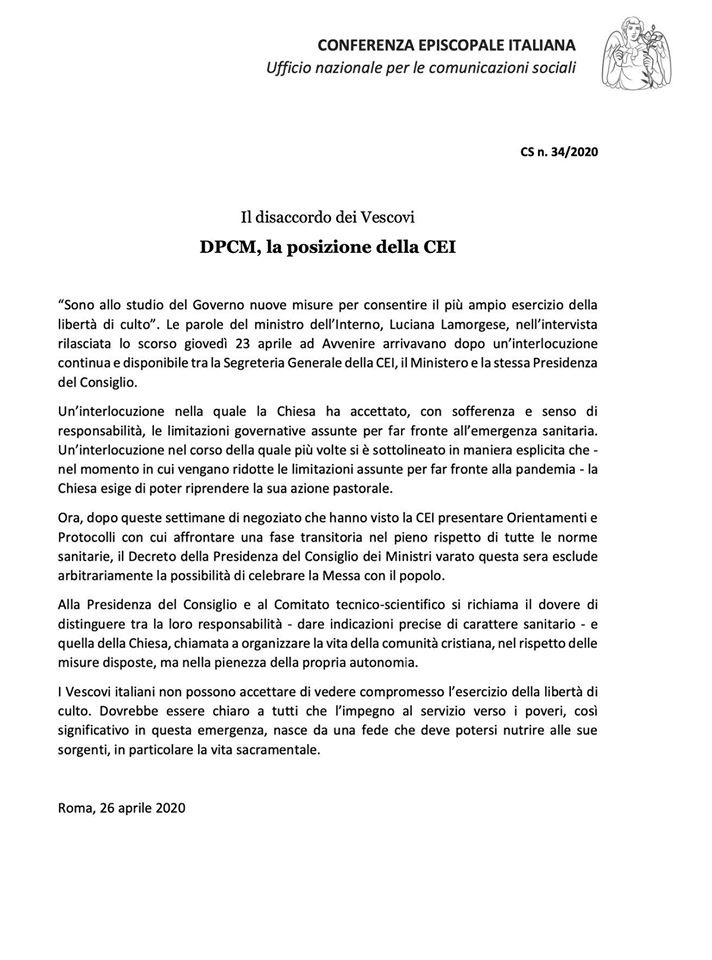 I Vescovi italiani non possono accettare di vedere compromesso lโesercizio della libertร di culto. Dovrebbe essere chiaro a tutti che lโimpegno al servizio verso i poveri, cosรฌ significativo in questa emergenza, nasce da una fede che deve potersi nutrire alle sue sorgenti, in particolare la vita sacramentale.