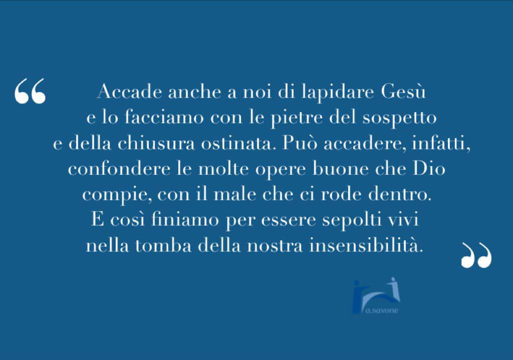 Non pensiamo di tirarci fuori da una simile esperienza come fosse cosa che non ci riguarda. Accade anche a noi di lapidare il vangelo che ci รจ stato consegnato e lo facciamo non con pietre materiali, forse, ma con quelle non meno violente del sospetto e della chiusura ostinata. Puรฒ accadere, molto piรน spesso di quanto immaginiamo, di avere una tale attrattiva per il peggio da confondere le molte opere buone che Dio compie, con il male che ci rode dentro.