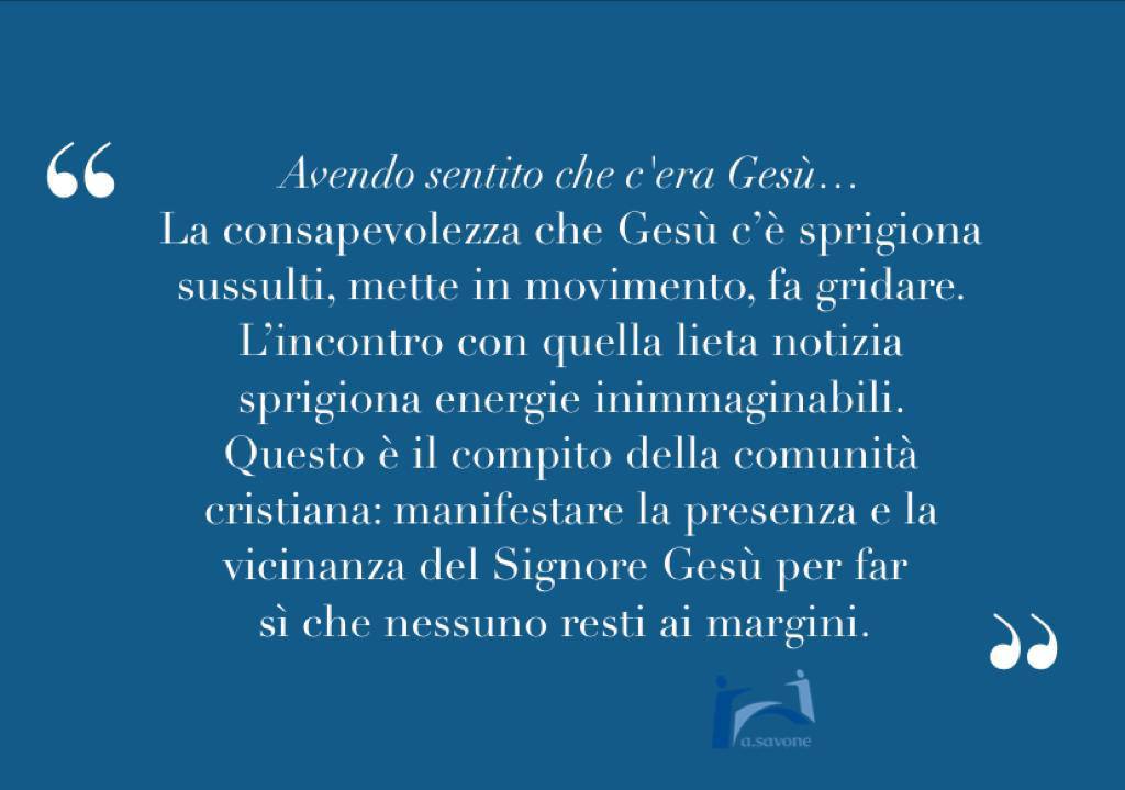 Bartimeoโฆ un non rassegnatoโฆ un non ripiegato, uno che non si lascia relegare ai margini: se la cecitร lo aveva collocato al margine di una strada non per questo lo doveva essere nella vita. E perciรฒ insorge: un vero tentativo di insurrezione il suo. Che cosa gli aveva donato tanta tenacia? Il testo originale dice: avendo sentito che Gesรน cโรจโฆ La consapevolezza che Gesรน cโรจ sprigiona sussulti, mette in movimento, fa gridare. Lโincontro con una lieta notizia sprigiona energie inedite e inaspettate. Questo รจ il compito della comunitร cristiana: manifestare la presenza e la vicinanza del Signore Gesรน per far sรฌ che nessuno resti ai margini.