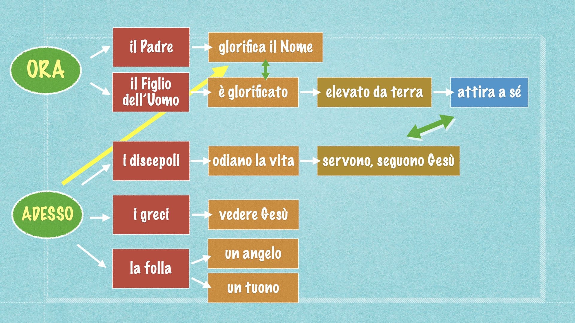 La linea temporale che ci appartiene ha anche degli altri protagonisti. Come la folla, che entra in scena nel momento in cui il Padre interviene. Considerate che nel vangelo di Giovanni non c’รจ il racconto della trasfigurazione. E questo รจ un intervento potente, รจ la manifestazione diretta massima del Padre nella storia degli uomini (la manifestazione totale rimane perรฒ il Figlio). Talmente grande che tutti coloro che sono presenti vengono coinvolti. Ma vengono coinvolti nel nei due modi che sono i due modi tipici con cui decodifichiamo gli eventi della nostra vita. C’รจ chi dice “รจ un angelo”. C’รจ chi dice “un tuono”. C’รจ chi dร una spiegazione scientifica o pseudo tale – รจ un tuono -. E c’รจ chi cerca una spiegazione spirituale, religiosa. Pericolosa, perchรฉ รจ comunque sbagliata. Oltre alla folla ci sono i famosi greci, i primi personaggi che abbiamo incontrato, che fanno una domanda e che non ricevono una risposta.