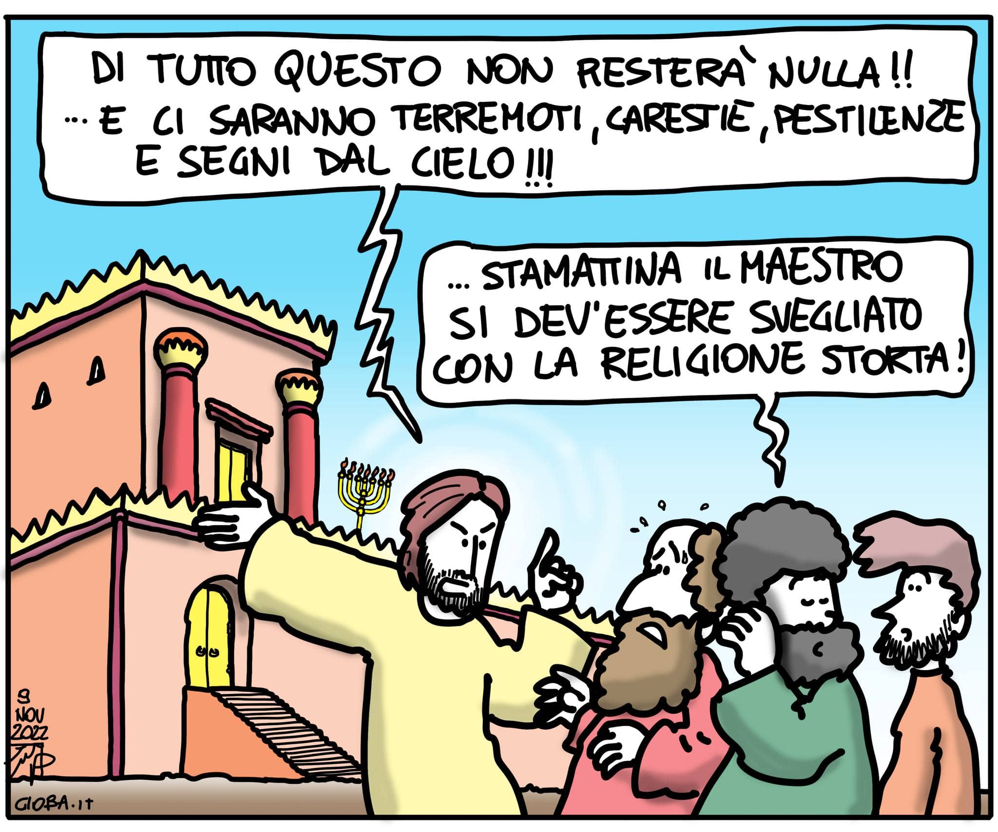 “Di quello che vedete, non sarร lasciata pietra su pietra che non sarร distrutta”, sentenzia il Maestro, e poi preannuncia guerre, carestie e pestilenze, persecuzioni e tradimenti. Gesรน parla in modo diretto con un linguaggio che gli studiosi chiamano โapocalitticoโ, che letteralmente significa โrivelativoโ, immaginando un futuro dalle tinte fosche e terribili e per nulla rassicuranti per chi lo ascolta.