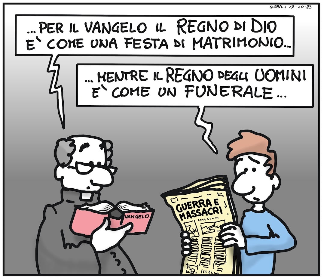E qui non possiamo non vedere quanta attualitร cโรจ nelle parole di Gesรน. La violenza delle guerre che continuano e si moltiplicano, รจ il risultato di chi rifiuta di entrare a far parte delle nozze di Dio nel mondo, e trasforma la storia umana da un possibile matrimonio dโamore ad un triste funerale.