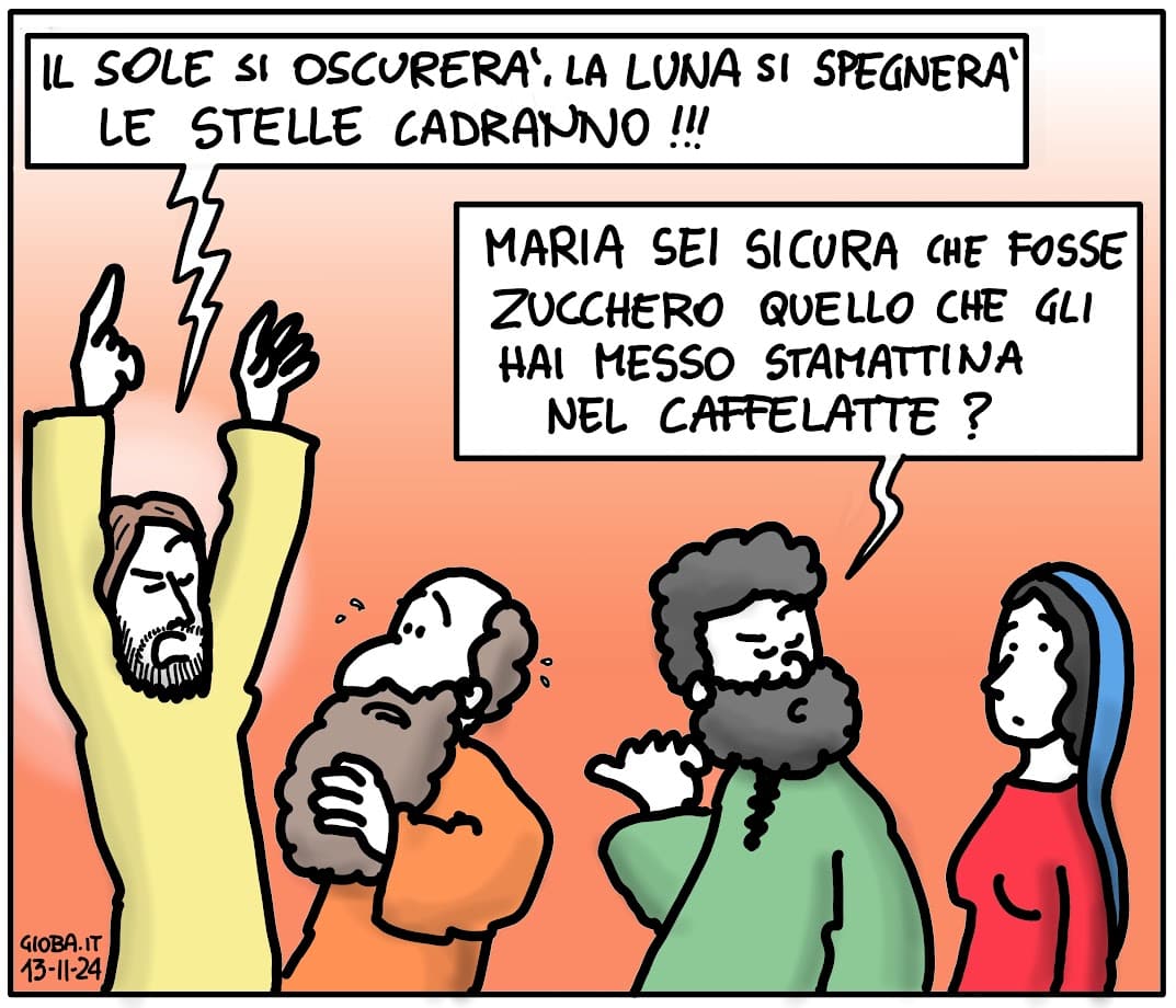 Ecco, per Gesรน tutto questo ha un termine, รจ destinato a cadere, anche se sembra intoccabile e irraggiungibile come lo sono gli astri del cielo. Nella comunitร dei credenti non cโรจ spazio per la paura come modo per soggiogare e tenere uniti, ma al contrario cโรจ spazio per la gioia e la speranza. Nella comunitร dei credenti in Cristo ci si prende cura delle paure del prossimo, di quello che lo lega al pessimismo e alla chiusura.