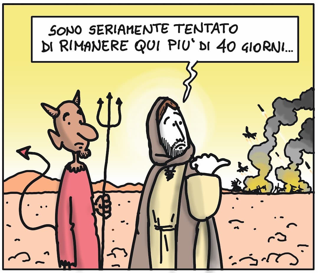 Nel breve brano del Vangelo, Marco ci racconta Gesรน che passa quaranta giorni nel deserto, prima di iniziare la sua missione. Il deserto con la sua mancanza di tutto diventa davvero un luogo grigio, senza la varietร dei colori della vita, degli incontri, della gioia. Il deserto ricorda quello che succede nella vita quando il bene viene a mancare, quando vengono a mancare le relazioni buone e la bellezza del vivere, e tutto si traduce in cercare solamente di sopravvivere. Questo รจ quello che succede quando la guerra spazza via con la violenza di una tempesta di sabbia, la convivenza pacifica tra le persone e i popoli. Quando in questi giorni vediamo le immagini della guerra a Gaza, in Ucraina, quando vediamo e rivediamo le immagini di altre guerre attuali o recenti, la sensazione รจ proprio di entrare in un deserto grigio senza vita e senza scampo, dove non cโรจ spazio per quello che colora la Storia dellโumanitร .