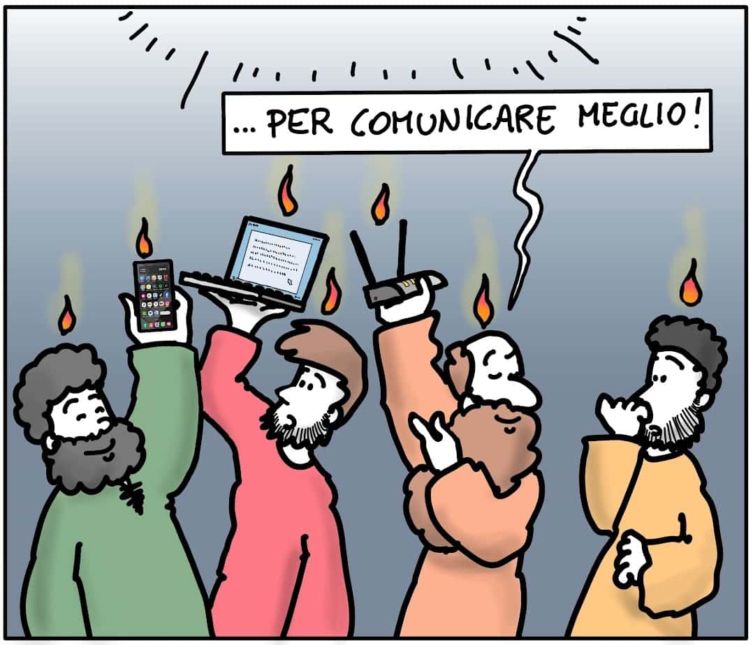 Nel giorno di Pentecoste i discepoli da paurosi in difesa, diventano coraggiosi comunicatori. Il vento dellโamore di Dio li spinge fuori e gonfia le vele del loro cuore. Le lingue di fuoco accendono le loro lingue e, non si sa come, ma tutti li capiscono quando parlano di Gesรน. ร a Pentecoste che nasce la Chiesa, ma non come spesso la intendiamo oggi, cioรจ unโistituzione in perenne difesa delle tradizioni, ma come amplificatore sempre nuovo della voce di Gesรน, capace di rinnovarsi e uscire dagli schemi, perchรฉ lโunico schema รจ il Vangelo.