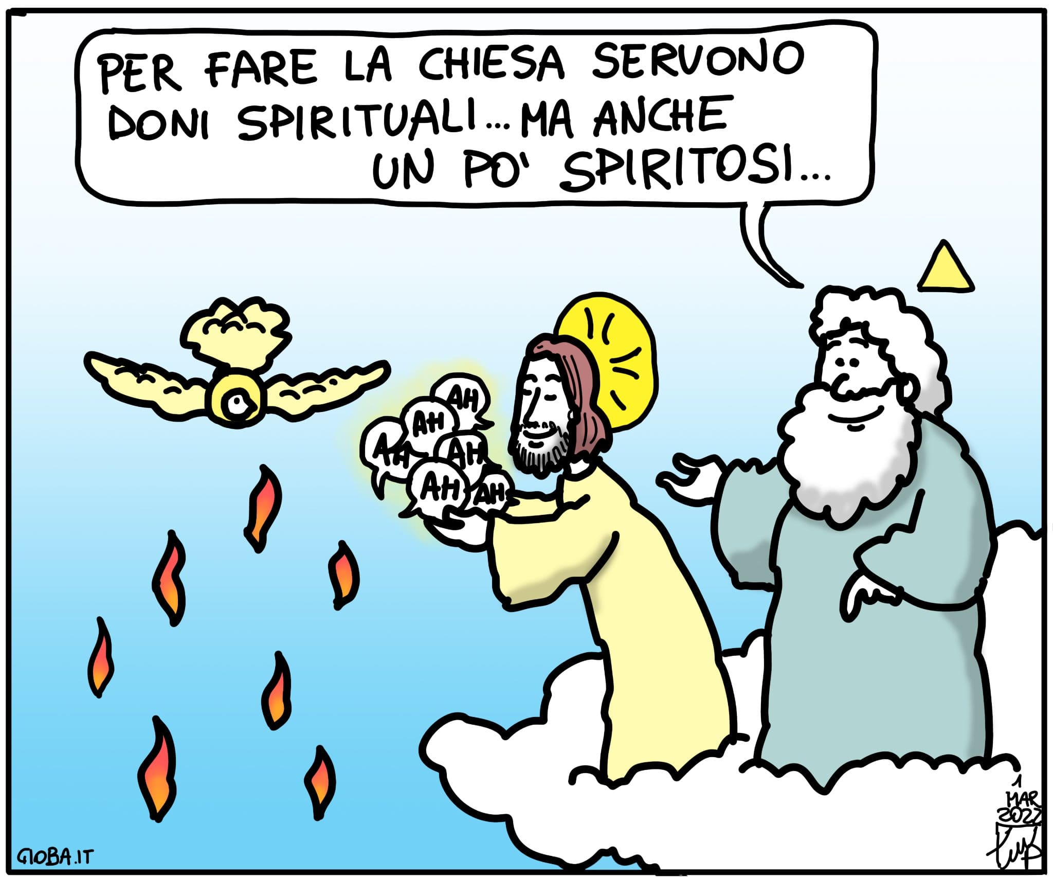 La Chiesa nata dalla Pentecoste รจ una comunitร di uomini e donne simpatici, spirituali e anche un poโ spiritosi, che sanno vestire i panni e le lingue del mondo, come ha fatto Gesรน, il piรน simpatico e spiritoso di tutti.