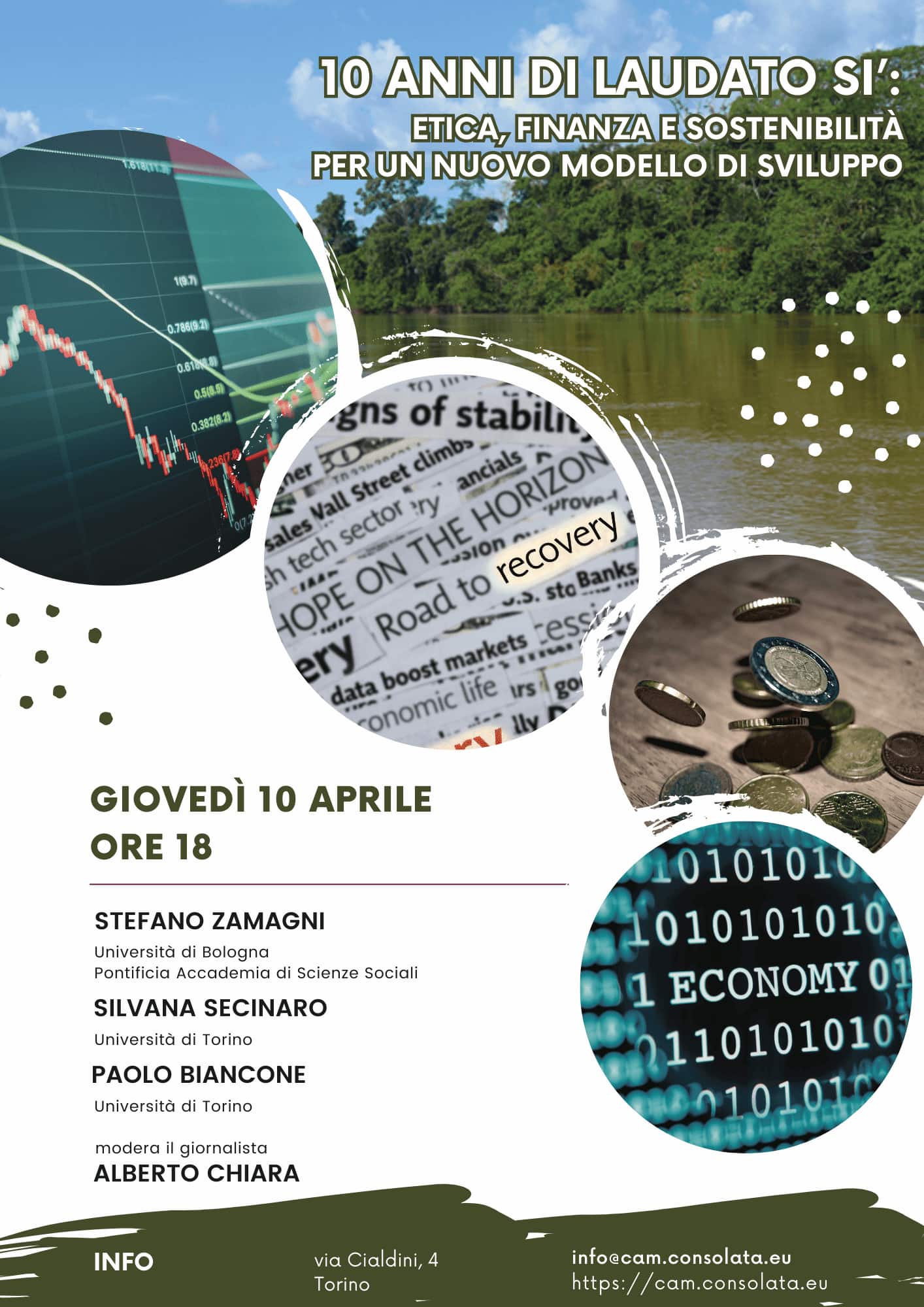 Per il secondo appuntamento del ciclo di incontri che il polo culturale “Cultures and Mission” (in breve CAM) dedica al decennale della pubblicazione dell’Enciclica “Laudato Si’” di Papa Francesco dedicata alla cura dell’ambiente naturalee delle persone, nonché su questioni più ampie del rapporto tra Dio, gli esseri umani e la Terra saranno ospiti gli economisti Silvana Secinaro, Paolo Biancone e Stefano Zamagni (collegato a distanza).