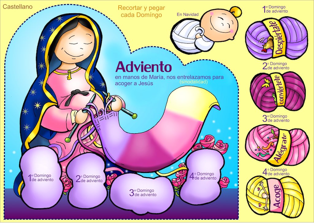 โMarรญa incinta (una piccola Guadalupana) prepara una coperta di lana per suo figlio. Lei รจ in uno stato di buona SPERANZA per tutti noi. Ogni domenica il vangelo ci rivela una parola, ci regala un gomitolo di lana che intrecceremo dentro di noi. Intrecciare, intrecciare, unire sarร simbolo di sinodalitร โ.