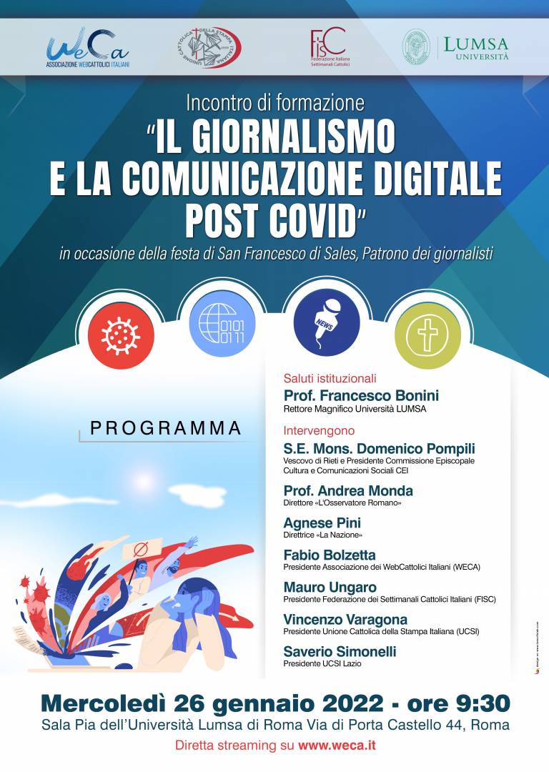 Relatori: Mons. Domenico Pompili, Vescovo di Rieti e Presidente Commissione Episcopale Cultura e Comunicazioni sociali CEI; Andrea Monda, Direttore de ยซLโOsservatore Romanoยป; Agnese Pini, Direttore de ยซLa Nazioneยป; Fabio Bolzetta, presidente dellโAssociazione WebCattolici Italiani (WECA); Mauro Ungaro, presidente della Federazione dei Settimanali Cattolici Italiani (FISC); Vincenzo Varagona, presidente dellโUnione Cattolica della Stampa Italiana (UCSI) e Saverio Simonelli, presidente Ucsi Lazio.