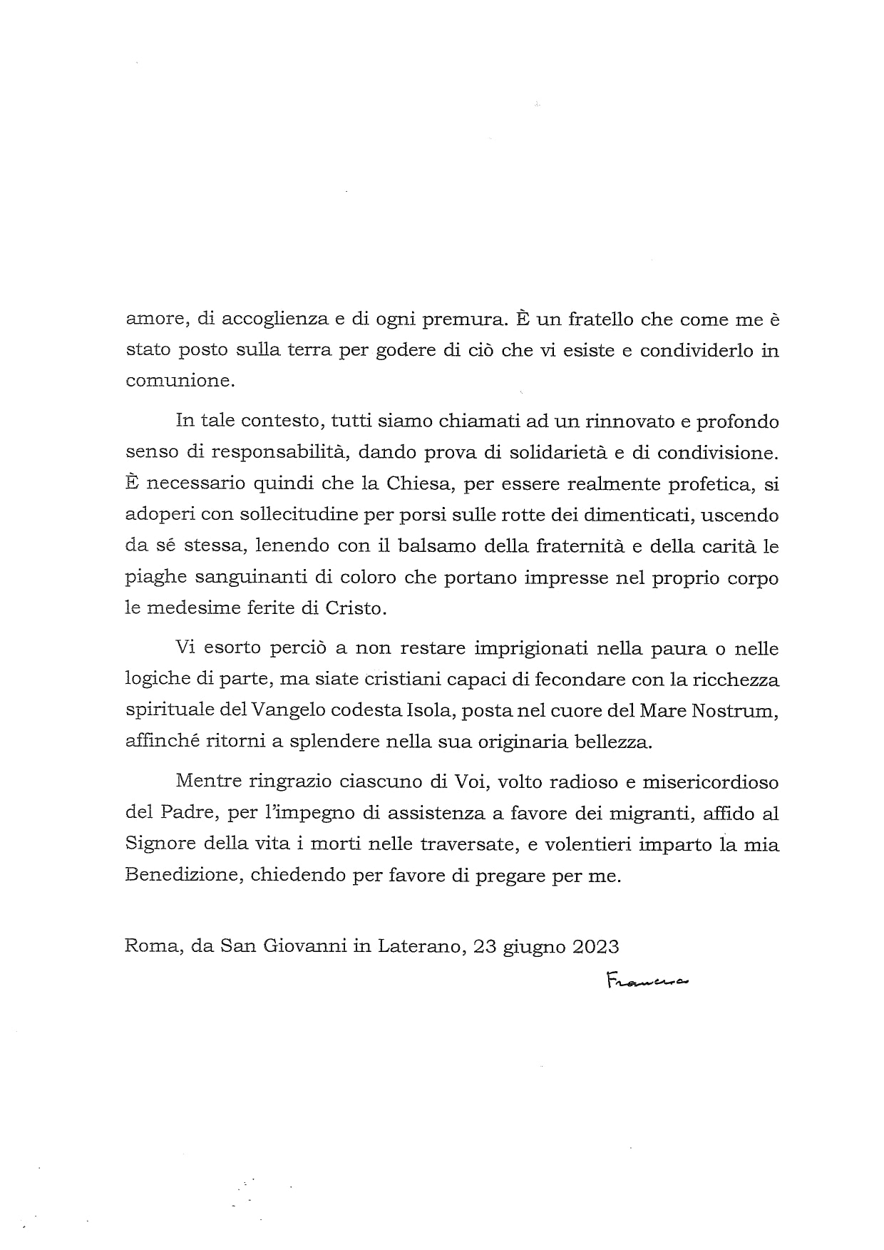 Sono trascorsi dieci anni dal viaggio che ho voluto compiere nella comunitร lampedusana per manifestare il mio sostegno e la paterna vicinanza a chi dopo penose peripezie, in balรฌa del mare, รจ approdato sulle vostre coste. Il consumarsi di sciagure cosรฌ disumane deve assolutamente scuotere le coscienze; Dio ancora ci chiede: โAdamo dove sei? Dovโรจ il tuo fratello?โ Vogliamo perseverare nellโerrore, pretendere di metterci al posto del Creatore, dominare per tutelare i propri interessi, rompere lโarmonia costitutiva tra Lui e noi? Bisogna cambiare atteggiamento; il fratello che bussa alla porta รจ degno di amore, di accoglienza e di ogni premura. ร un fratello che come me รจ stato posto sulla terra per godere di ciรฒ che vi esiste e condividerlo in comunione.