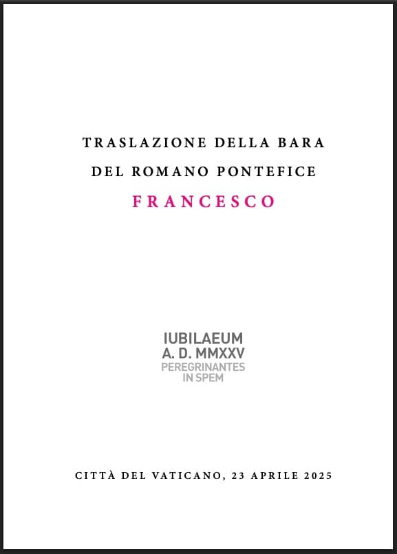 Il libretto ufficiale per la traslazione della bara del Romano Pontefice Francesco. Questo PDF delinea la liturgia che si terrร il 23 aprile 2025 nella Cittร del Vaticano, specificamente nella Basilica Vaticana.