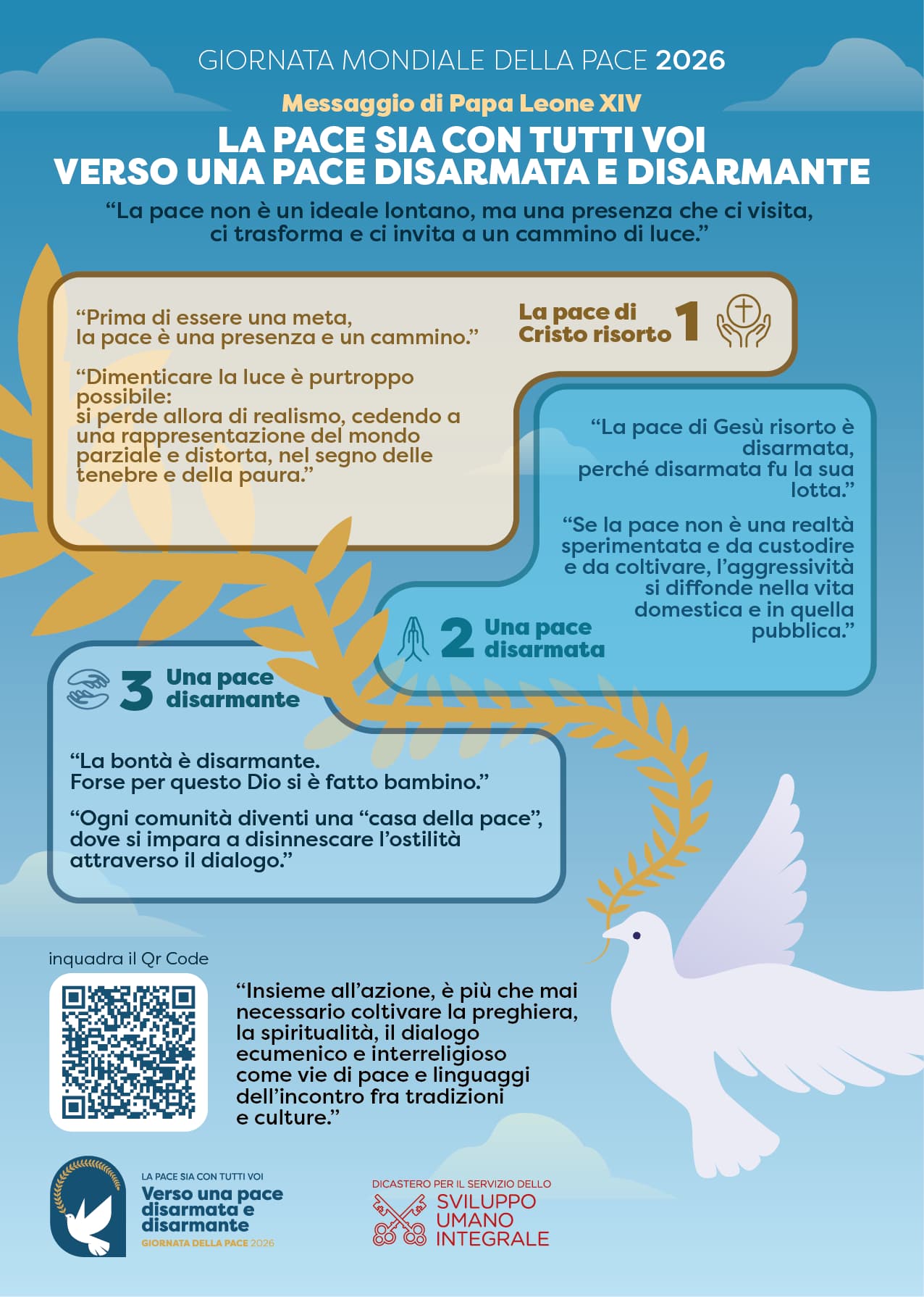 Possa essere questo un frutto del Giubileo della Speranza, che ha sollecitato milioni di esseri umani a riscoprirsi pellegrini e ad avviare in sé stessi quel disarmo del cuore, della mente e della vita cui Dio non tarderà a rispondere adempiendo le sue promesse: «Egli sarà giudice fra le genti e arbitro fra molti popoli. Spezzeranno le loro spade e ne faranno aratri, delle loro lance faranno falci; una nazione non alzerà più la spada contro un’altra nazione, non impareranno più l’arte della guerra. Casa di Giacobbe, venite, camminiamo nella luce del Signore» (Is 2,4-5).