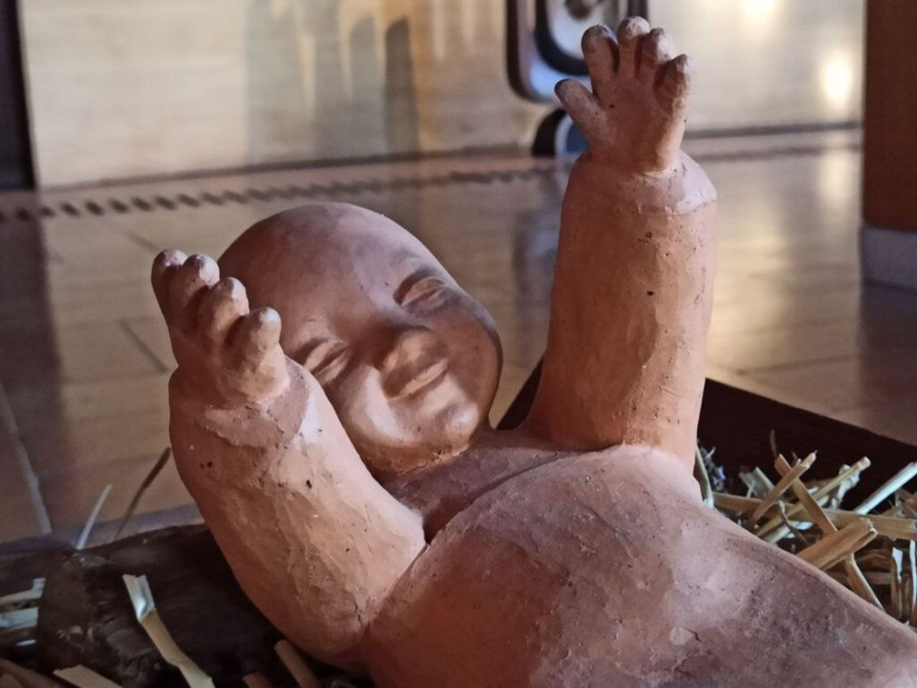 Lโimmagine del Bambino adagiato su un poโ di paglia: nella sua semplicitร ci accoglie a braccia aperte. Quelle braccia che somigliano troppo a quelle che un giorno saranno inchiodate ad una croce. Sรฌ, quel Bambino che silenzioso ci guarda chiedendoci di non resistere alla sua tenerezza, lo ritroveremo appeso alla croce: anche lรฌ, silenzioso, ci dice la stessa cosa. Sono le braccia aperte, segno di accoglienza e di dono di sรจ, a tratteggiare dallโinizio alla fine la storia di Gesรน.