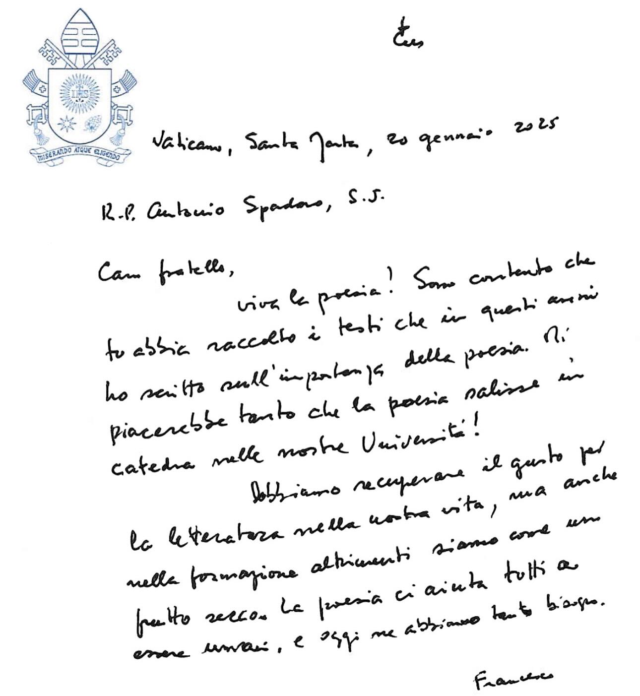 Papa Francesco ha voluto ringraziare il curatore di questo volume (immagine qui sotto), unico nel suo genere, con un biglietto autografo nel quale, tra lโaltro, esprime il desiderio che la poesia salga in cattedra in tutte le Istituzioni accademiche pontificie.