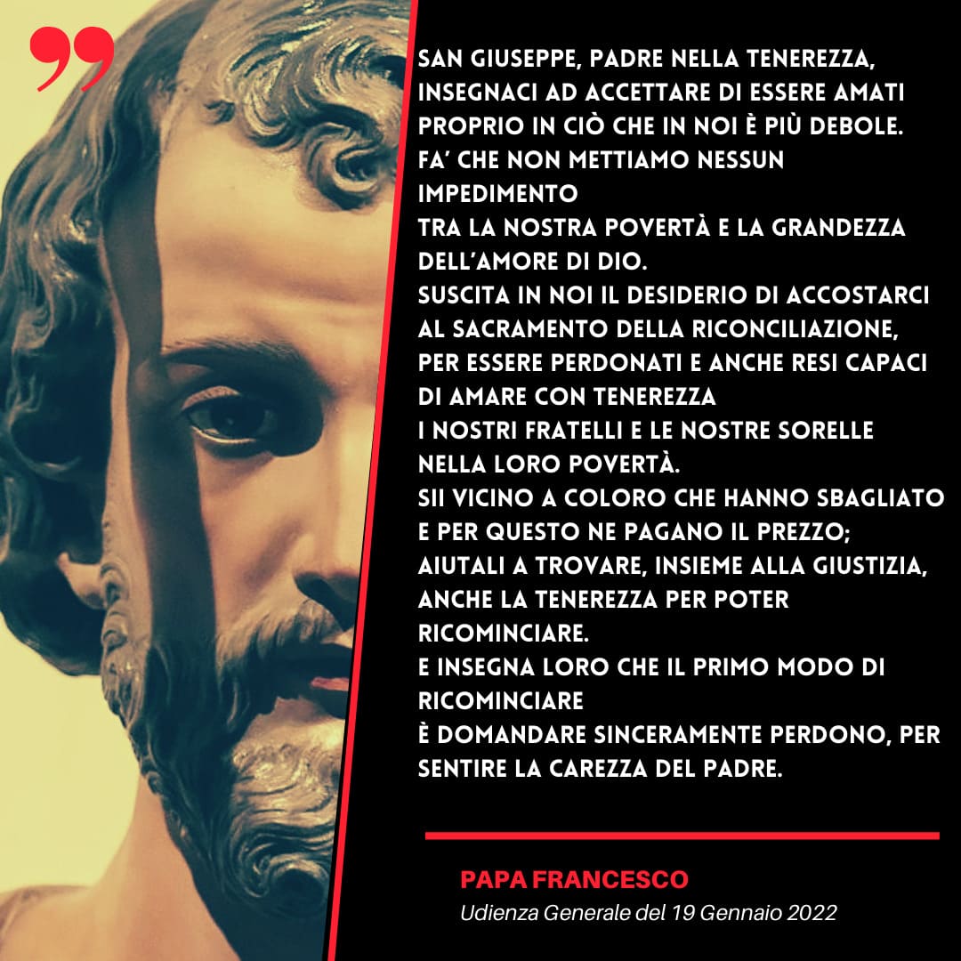 Ci fa bene allora specchiarci nella paternitร di Giuseppe che รจ uno specchio della paternitร di Dio, e domandarci se permettiamo al Signore di amarci con la sua tenerezza, trasformando ognuno di noi in uomini e donne capaci di amare cosรฌ. Senza questa โrivoluzione della tenerezzaโ โ ci vuole, una rivoluzione della tenerezza! โ rischiamo di rimanere imprigionati in una giustizia che non permette di rialzarsi facilmente e che confonde la redenzione con la punizione. Per questo, oggi voglio ricordare in modo particolare i nostri fratelli e le nostre sorelle che sono in carcere. ร giusto che chi ha sbagliato paghi per il proprio errore, ma รจ altrettanto giusto che chi ha sbagliato possa redimersi dal proprio errore. Non possono esserci condanne senza finestre di speranza. Qualsiasi condanna ha sempre una finestra di speranza. Pensiamo ai nostri fratelli e alle nostre sorelle carcerati, e pensiamo alla tenerezza di Dio per loro e preghiamo per loro, perchรฉ trovino in quella finestra di speranza una via di uscita verso una vita migliore.