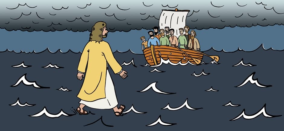Oggi, dopo prender cura delle persone, Gesù rimane a terra a pregare, pregare, pregare … Gli Apostoli hanno preso la barca. Poi, a tarda notte, il Signore va a loro. A piedi! Simone Pietro, chiamato da Gesù, è anche in grado di camminare sulle acque. Ma quando si alza il vento, si spaventa … e comincia ad affondare.