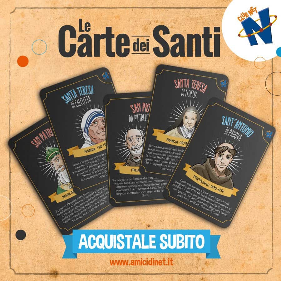 Sono presenti sulle card: San Giovanni Bosco, Santa Bernadette, Santa Elisabetta dโ€™Ungheria, Santa Teresa di Lisieux, San Giovanni Paolo II, Santa Chiara dโ€™Assisi, Santa Caterina da Siena. San Francesco dโ€™Assisi, Santa Rosa da Lima, San Massimiliano Maria Kolbe, San Giuseppe, Santโ€™Antonio di Padova. San Pietro, San Tommaso dโ€™Aquino, San Giovanni XXIII e San Pio da Pietrelcina. Ma anche San Tommaso Moro, San Patrizio, San Tarcisio, Santโ€™Elena, San Filippo Neri e San Giovanni Battista de La Salle.