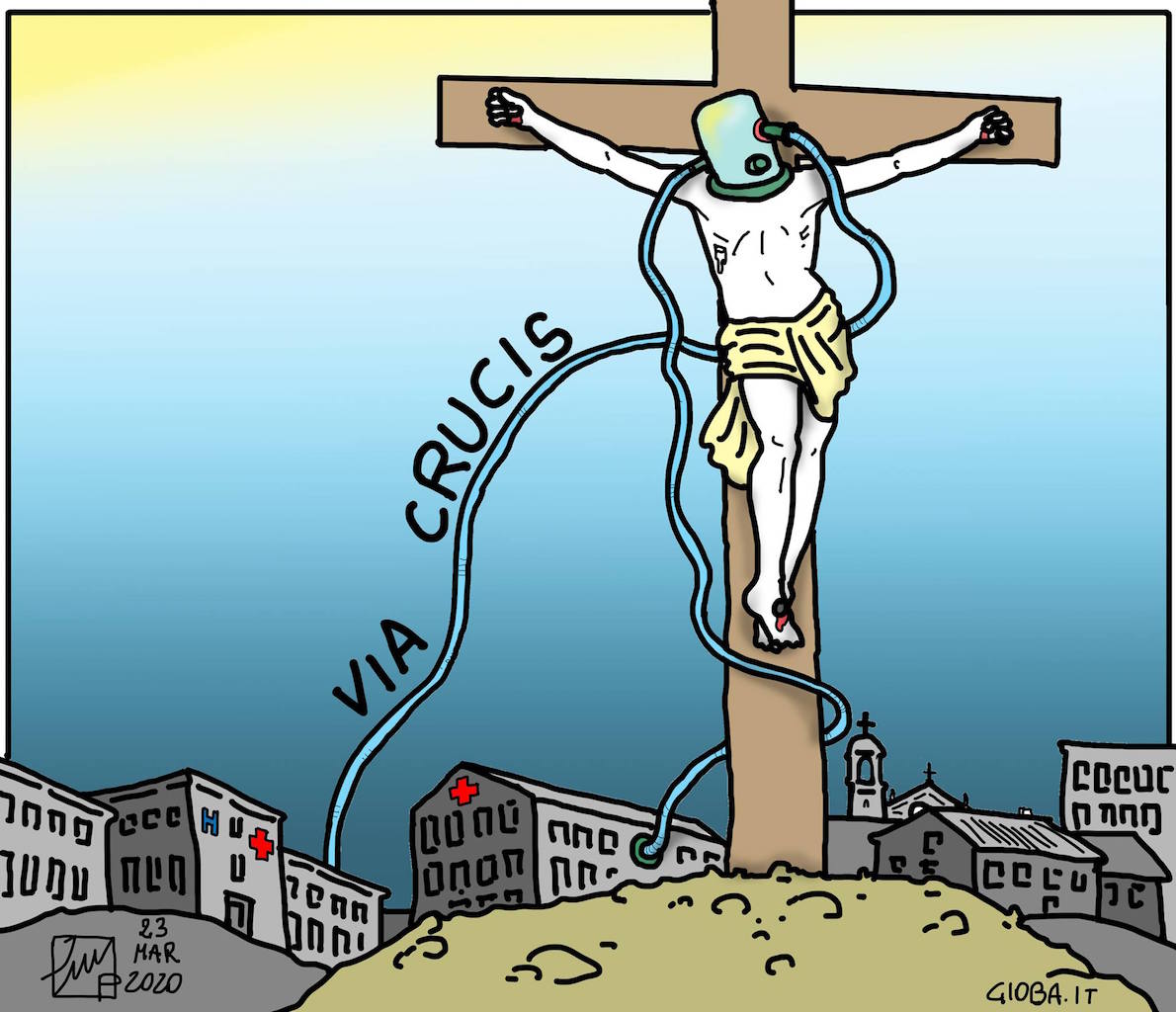 Ci viene presentato l’episodio della morte e rivivificazione di Lazzaro, un amico a cui è particolarmente legato Gesù. Mi commuove la reazione di Gesù che pur sapendo che Lazzaro tornerà in vita, piange. La fede infatti non è una caparra contro le difficoltà, non ci mette al sicuro dai problemi e dalle lacrime. E questi giorni ce lo stanno dimostrando! Le lacrime di Gesù allora sono il segno più vero di una prossimità che Dio ha scelto di avere con ciascuno di noi: c’è una vignetta – uscita pochi giorni fa – del carissimo amico “Gioba” (che metto in fondo al commento), in cui un Gesù Crocifisso vive la Via Crucis di tutti i contagiati da COVID-19: è la rappresentazione più immediata del posto dove si trova ora Dio.